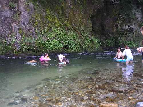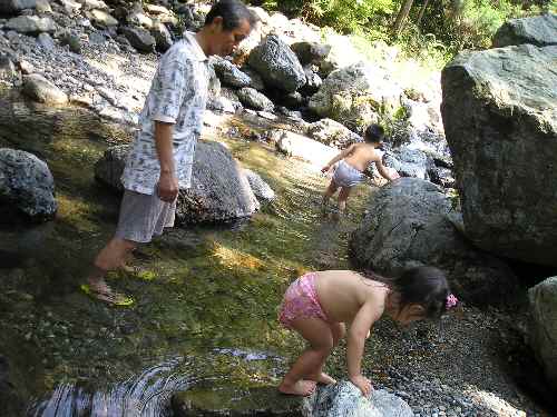 お昼を済ませてうちから20分くらいのとこの 宇賀峡へ川遊びに連れて行きました。 浅くて小さい子が遊ぶのにはいいとこです。 石に苔がついてて 目が離せないけど 人がいなしパンツ一丁で よ~く遊びました。 |